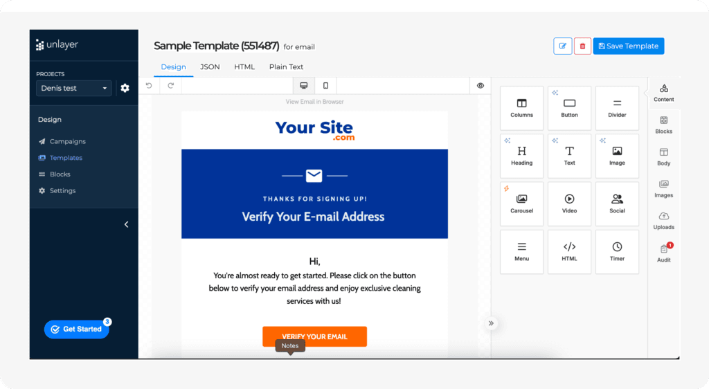 Unlayer.com is a drag & drop email template builder. It has a very generous free plan that gives you everything you need to create great looking templates that work on desktop and mobile devices. It also comes with a lot of pre-built templates that you can take and modify to fit your needs.