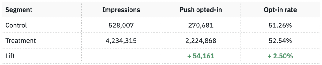 The primary goal of this in-app is to increase push opt-ins, and it was fairly successful, achieving a 2.5% increase, translating to 54,100 additional users with push enabled.