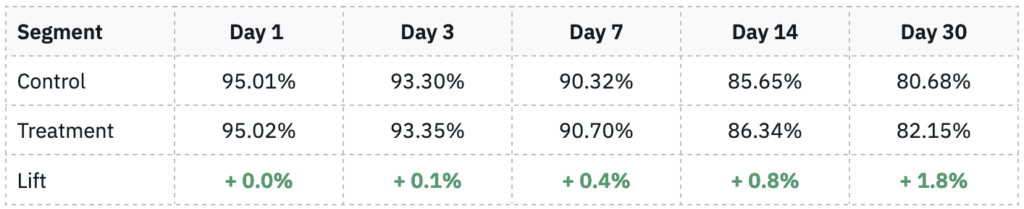 Furthermore, engaging additional users through push notifications improved their 30-day retention rate (based on sessions) by 1.8%.