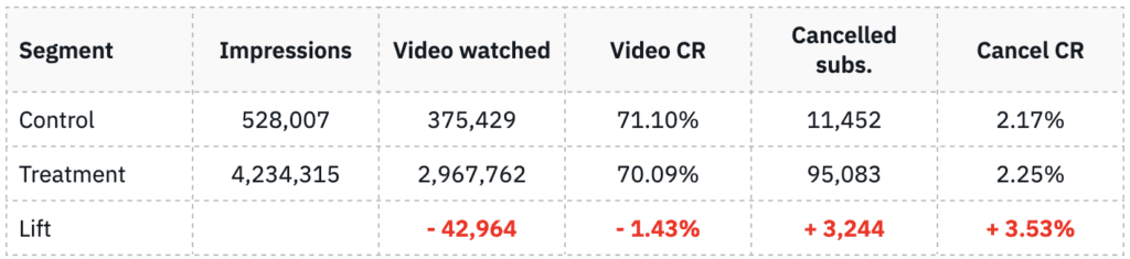 Additionally, there is a 3.5% increase in subscription cancellations, which is more than 3,200 lost subscriptions! For users who received the in-app two times, the increase in cancellations goes up to 6%.